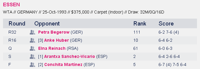 На пути к титулу наша теннисистка обыграла трех лидеров посева: 10-ю ракетку мира Анке Хубер во втором раунде, 2-ю ракетку мира Аранчу Санчес-Викарио в полуфинале и 5-ю ракетку мира Кончиту Мартинес в финале.