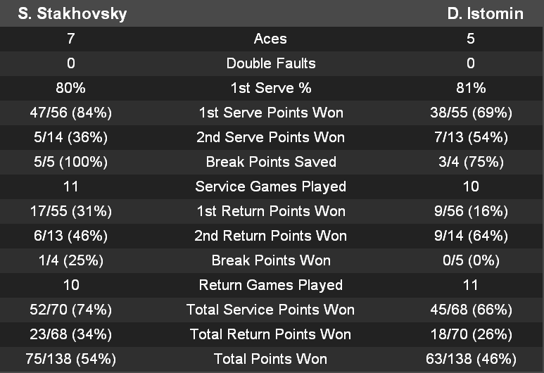В стартовой партии у каждого из соперников было по одному брейкпоинту, но сделать брейк игрокам не удалось. Стаховский сумел заработать преимущество на тайбрейке, а во втором сете выиграть единственный брейк в этом матче.