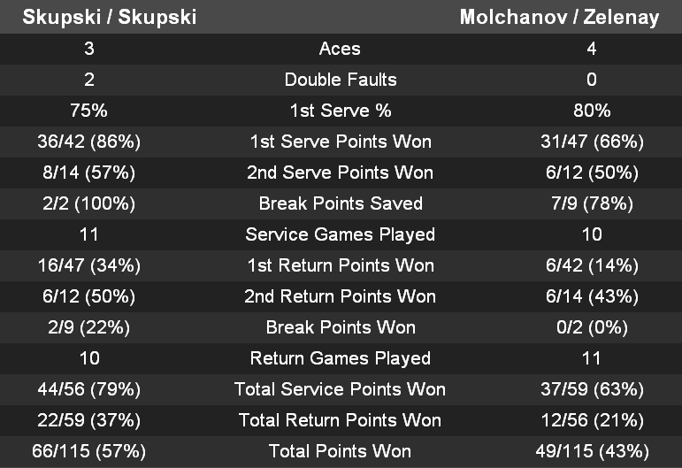 Денис Молчанов (Украина) / Игор Зеленый (Словакия) — [4] Нил Скупски / Кен Скупски (Великобритания) 5-7 3-6