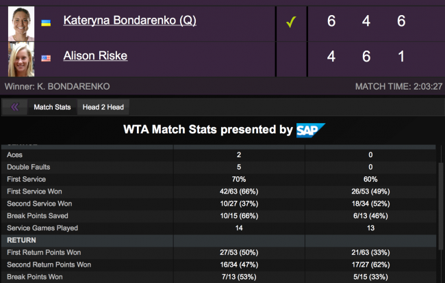 За 2 часа 3 минуты, Катерина сломила сопротивление 45-й ракетки мира, американки Элисон Риске: 6-4 4-6 6-1. За время поединка Бондаренко два раза подала навылет, допустила три двойные ошибки и реализовала семь брейк-пойнтов из тринадцати на подаче соперницы.