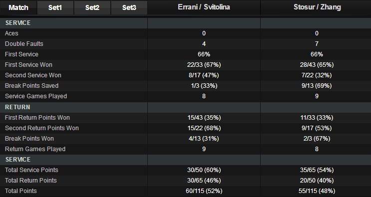 Элина Свитолина (Украина) / Сара Эррани (Италия) — Саманта Стосур (Австралия) / Чжан Шуай (Китай) 6-1 4-6 5-10