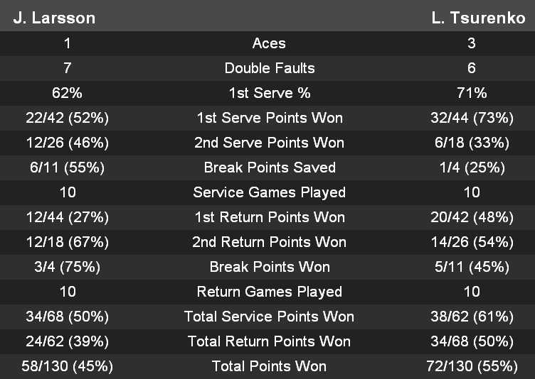 Украинка вновь вела, сделав ранний брейк уже во втором сете (3-0), когда Ларссон смогла выиграть гейм на подаче соперницы (3-1), а затем и сравнять счет в партии (4-4). Цуренко всухую берет еще один гейм шведки и завершает встречу на своей подаче.