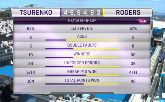 Два шанса выиграть гейм соперницы было у Цуренко при счете 1-0, но Роджерс подачу удержала. Единственный брейк в этом сете Леся сделала в шестом гейме и возможностей отыграться у американки так и не появилось.