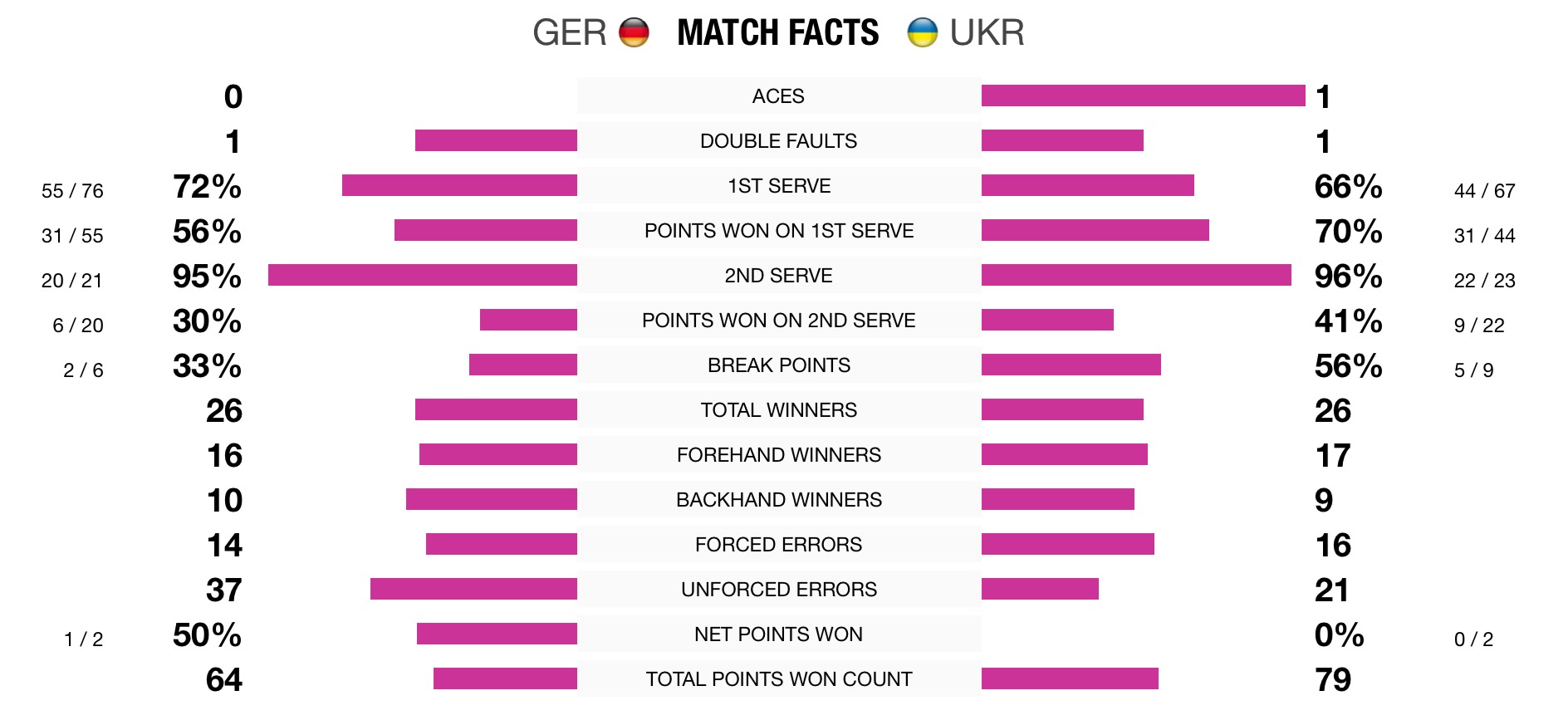 Во второй партии Свитолина сумела отыграться с брейка: с 0-2 украинка выиграла сразу шесть геймов подряд. Таким образом, Элина Свитолина приносит первую победу в копилку «сине-желтых». Свитолина уже в четвертый раз подряд обыгрывает Анжелик Кербер и выходит вперёд в личном противостоянии: 6-5.