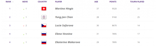 Это случилось после победы Мартины Хингис и Чжань Юнжань на турнире в Ухане и потери очков Люси Шафаржовой, которая не выступала в Китае из-за травмы, а в прошлом сезоне завоевала там титул.