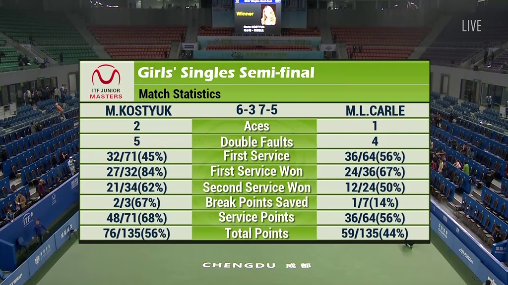 В финале Костюк сыграет против Кайи Юван из Словении, которую уже обыгрывала на этом турнире в последнем матче группового этапа. Словенка в своём полуфинале только в первом сете ощутила сопротивление первой ракетки мира Уитни Осигве из США: 7:5, 6:1.