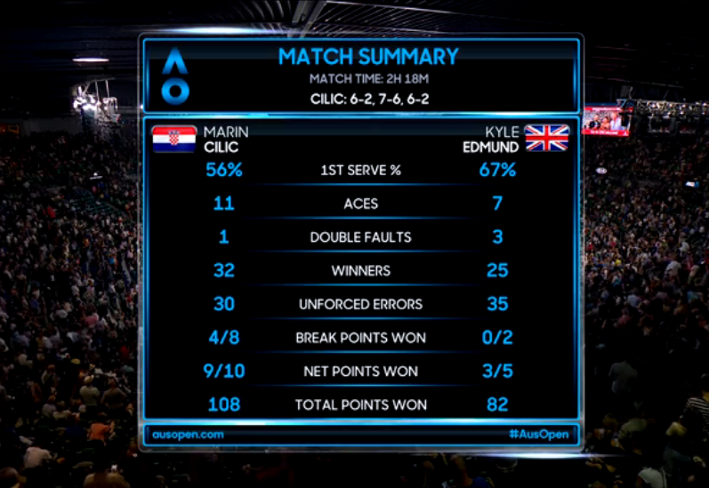 Чилич сумел выполнить четыре брейка (по два — в первой и третьей партиях), не отдав ни одного гейма на своей подаче. За весь матч у Эдмунда было всего два брейкпоинта (в стартовом гейме). Для 23-летнего британца это был дебют в полуфиналах на мэйджорах. В 1/4 Кайл остановил прошлогоднего полуфиналиста соревнований и третью ракетку мира Григора Димитрова.
