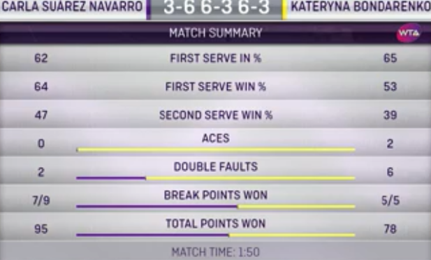 Катерина Бондаренко (Украина, Q) — Карла Суарес-Наварро (Испания) 6-3, 3-6, 3-6