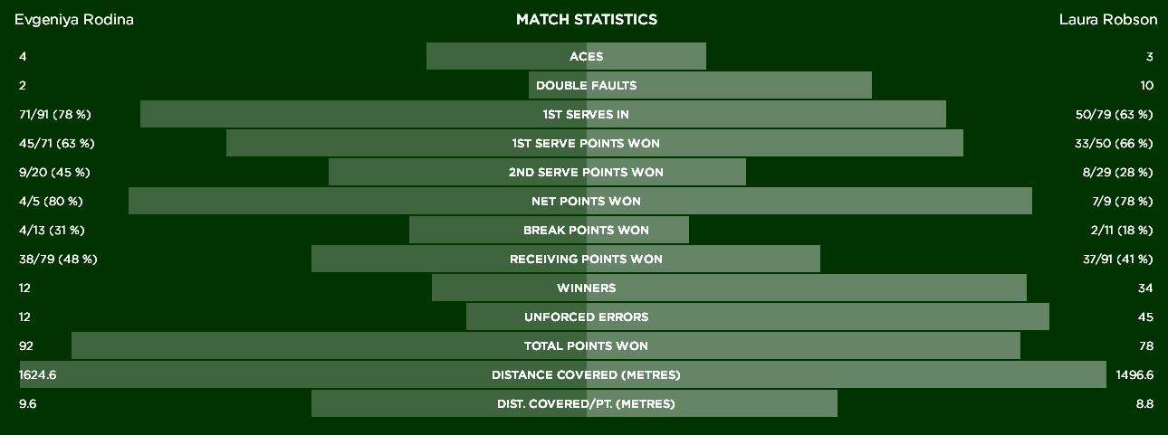 Сегодня же болельщики, вероятно, ожидали, что родные стены помогут Робсон в матче с Евгенией Родиной. Однако, волшебного возвращения на корты Уимблдона не случилось. Россиянка довольно прогнозировано одержала победу в двух партиях.