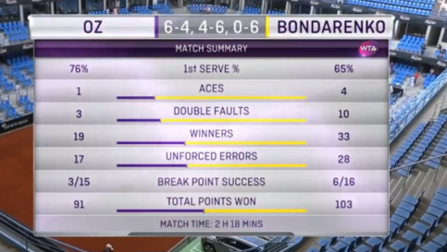 Почти 2,5 часа продолжалось противостояние нашей теннисистки с 612-й ракеткой мира. Потеряв преимущество со счета 3-1 во второй партии, Бондаренко отдала сопернице до конца поединка только один гейм.