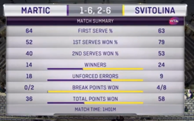 Отыграв на старте поединка брейкпоинт, украинка оформила два брейка и защитила все геймы на своей подаче в первом сете. Во второй партии Свитолина дважды выполнила брейк и не дала сопернице заработать хотя бы один брейкпоинт на своих геймах.