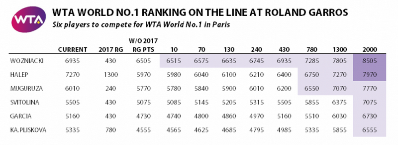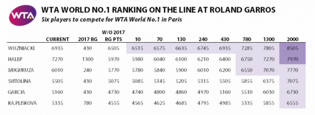 Возняцки в случае победы на турнире, независимо от результатов соперниц, возглавит рейтинг. То же касается и Симоны Халеп. Если в финале сойдутся эти две теннисистки, то они не только разыграют титул, но и поспорят за право возглавить рейтинг с 11-го июня. Подобный сценарий воплотился в реальность в конце января, когда датчанка обыграла представительницу Румынии в решающем матче на Australian Open.