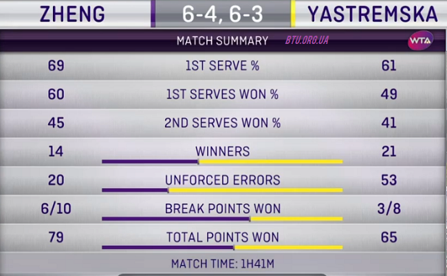 Даяна Ястремская (Украина, Q) — Чжэн Сайсай (Китай, WC) 4-6, 3-6
