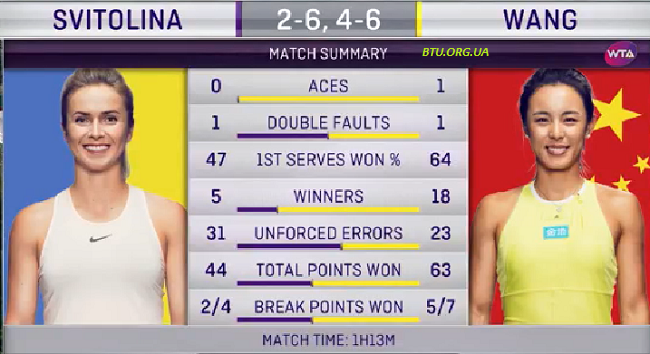 Элина Свитолина (Украина, 1) — Ван Цян (Китай, 6) 2-6, 4-6