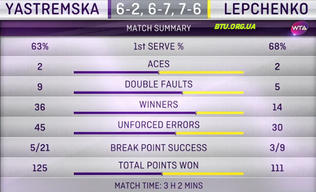 При счете 5*-6 во втором сете Ястремская не воспользовалась тремя матчболами, а затем упустила преимущество 6-3 на тайбрейке. Лепченко не реализовала четыре шанса завершить партию в свою пользу, а с пятого сетбола все-таки перевела игру в решающий сет.