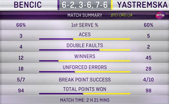 В итоге игра перешла на тайбрейк, где с 1-2 Ястремская вышла вперед 4-2, но надолго отрыв не удержала. Уступая 2-4, Бенчич взяла пять из следующих шести розыгрышей и оформила путевку в финал. Девушки провели на корте почти 2,5 часа.