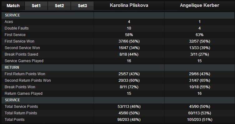 А. Кербер (5, Германия) — К. Плишкова (4, Чехия) 6:3, 5:7, 6:4