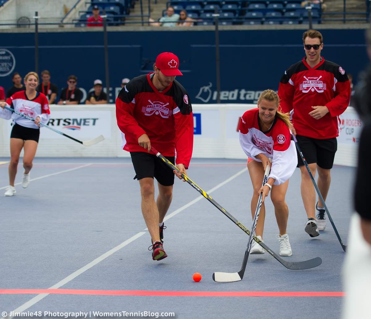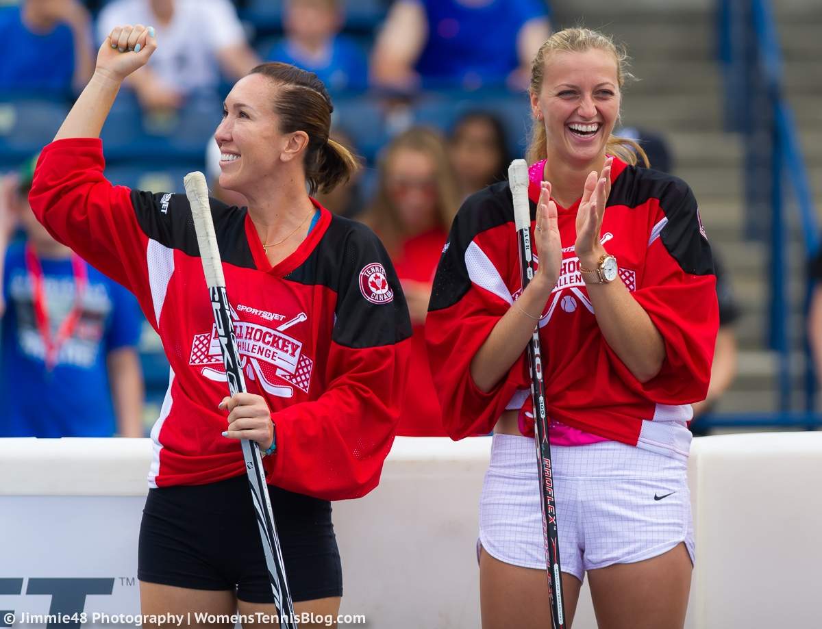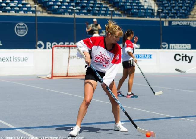 — на старте соревнований организаторы «Rogers Cup» решили испытать таланты игроков в других видах спорта. Елена Янкович, Петра Квитова, Люси Шафаржова, Тими Бачински, Эжени Бушар в Торонто попробовали свои силы в хоккее. А в Монреале Гаэль Монфис и Давид Гоффен сменили теннисный мяч на футбольный.