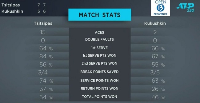 Соперники встретились на площадке в третий раз. В 2018 году Циципас и Кукушкин сыграли в Дубае и в квалификации в Риме. Оба матча в трех сетах выиграл представитель Греции. Сегодня поединок теннисистов продолжался 2 часа. В первой партии Циципас реализовал один из двух своих брейкпоинтов, а во втором сете отыгрался со счета 3-5. Кукушин заработать сетболы не сумел, а на тай-брейке проиграл своему сопернику одно очко на подаче.