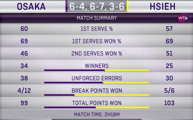 Решающий сет Осака начала с двух подряд выигранных геймов, но тайваньке удалось сравнять счёт. Японка вновь вышла вперёд, но следующие четыре гейма остались за тайваньской теннисисткой.