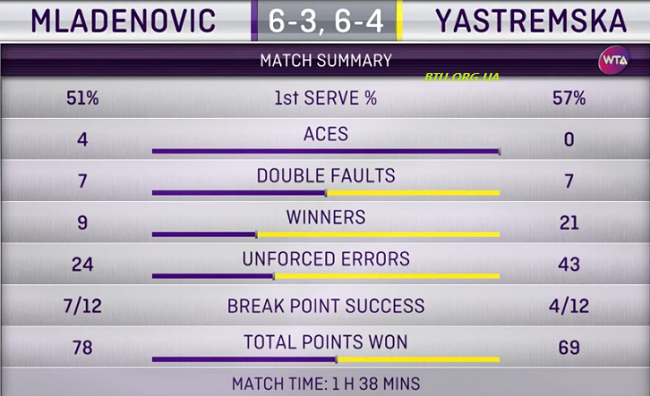 Теннисистки провели на корте 1 час и 38 минут. Со счета 2-2 в первом сете Ястремская выиграла два гейма из следующих девяти. Уступая 1-3 во второй партии, украинка сравняла счет (4-4), после чего Младенович защитила подачу и воспользовалась матчболом на подаче соперницы.