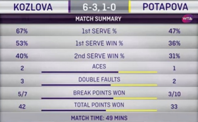 Катерина Козлова получила путевку во второй раунд после того, как соперница снялась с поединка после первого гейма во второй партии. По ходу матча Потапова проиграла все геймы на своей подаче: Козлова оформила 5 брейков, а её соперница — 3.