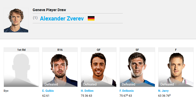 Немец выиграл свой третий подряд трехсетовый матч в Женеве. На тай-брейке Зверев не использовал свои матчболы со счета 6-3, после чего отыграл два матчбола соперника. Теннисисты провели на корте 2,5 часа, но поединок несколько раз прерывался из-за дождя.