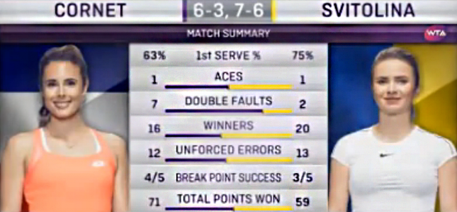 Для Элины Свитолиной это первое поражение от Ализе Корне с 2013 года и турнира в Москве, после этого украинка выиграла в их четырех очных поединках.