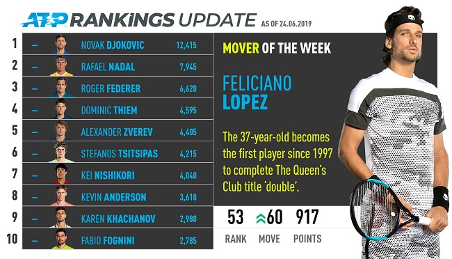 Чемпион турнира в Лондоне Фелисиано Лопес, который начинал прошлую неделю за пределами топ-сотни, преодолел 60 позиций и занял 53-е место. Для испанца это лучший результат в рейтинге за последний год.