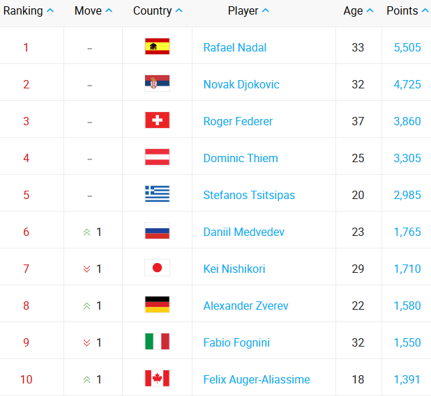 В чемпионской гонке сезона топ-5 теннисистов сохранила свои позиции.