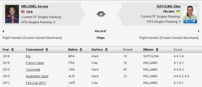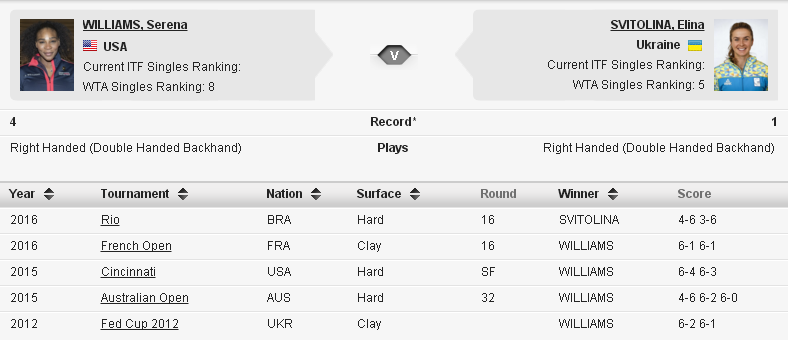 Серена проведёт 38-й полуфинал на турнирах Большого Шлема и 13-й в Нью-Йорке, в котором она встретится с Элиной Свитолиной. Уильямс обыгрывала украинку четыре раза, но уступила ей в последней встрече, которая прошла в 2016 году в рамках Олимпийского турнира в Рио-де-Жанейро.