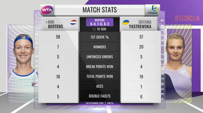 Поединок продолжался 1 час и 56 минут. Бертенс записала в свой актив 5 эйсов при 4 двойных ошибках, реализовала 4 брейкпоинта из 7. На счету Ястремской также 4 реализованных брейкпоинта (из 10), 1 эйс при 6 двойных ошибках. По ходу решающей партии украинка проигрывала 0-5, но сумела вернуть один брейк, отыграв также 2 матчбола на своей подаче.