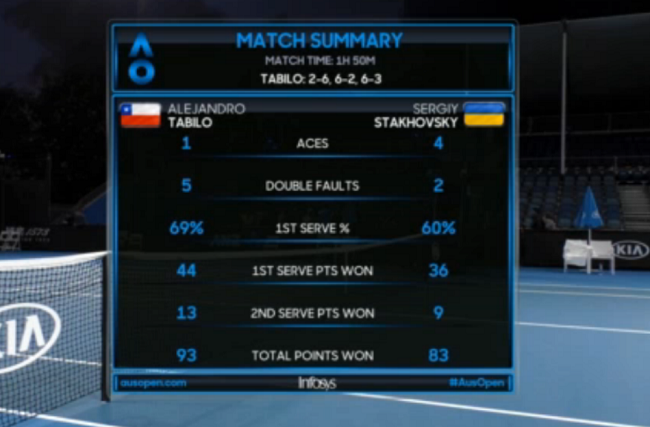 Соперники провели на корте почти 2 часа. Стаховский реализовал 3 брейкпоинта из 7, а Табило — 4 из 10.
