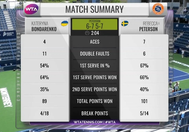 Соперницы провели на корте около 2 часов. Бондаренко за всю игру оформила 4 брейка, а Петерсон — 5.