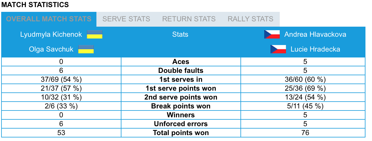 В своем стартовом поединке, украинки со счетом 0-6 6-7(4) уступили девятой сеянной паре турнира из Чехии, 2-х кратным победительницам турниров «Большого шлема» Люси Храдецкой и Андреа Хлавачковой. За 1 час 22 минуты, которые продолжался поединок, украинки ни разу не подавали навылет, допустили шесть двойных ошибок и реализовали два брейк-поинта из шести на подаче соперниц.