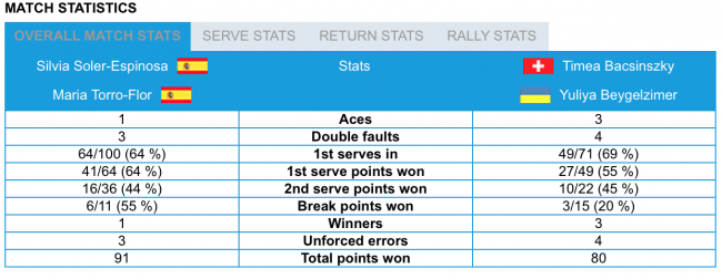 В стартовом поединке, украинско-швейцарская пара в составе Юлия Бейгельзимер / Тими Бачински уступила испанскому дуэту Сильвия Солер-Эспиноза / Мария-Тереза Торро-Флор 6-4 2-6 1-6.