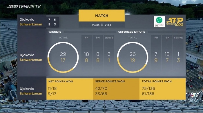 Финальный поединок продолжался почти 2 часа. Джокович оформил в свой актив 5 брейков при 9 брейкпоинтах, Шварцман реализовал 3 из 6 шансов на брейк.
