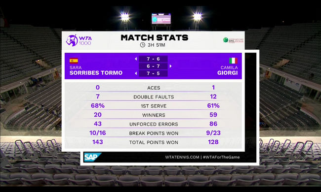 Сара Соррибес-Тормо в стартовом сете отыграла три сетбола соперницы, уступая 4:5, а во втором сете проигрывала 2:5, но сумела перевести игру на тай-брейк, в котором проиграла только с шестого сетбола. В решающем сете Камила Джорджи вела 4:0 и 5:3, но затем испанка выиграла четыре гейма подряд. Теннисистки провели на корте 3 часа 51 минуту игрового времени — это самый затяжной матч сезона в WTA-туре. Ранее данное достижение принадлежало Ирине-Камелии Бегу и Йоханне Конте, матч которых на турнире в Мельбурне продолжался 3 часа 33 минуты. Во втором круге испанка встретится с чемпионкой Mutua Madrid Open Ариной Соболенко.