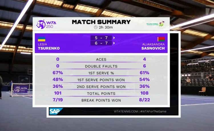 Теннисистки провели на корте 2,5 часа. Цуренко реализовала 7 из 19 брейкпоинтов, а Саснович удалось оформить 8 из 22 шансов на брейк.