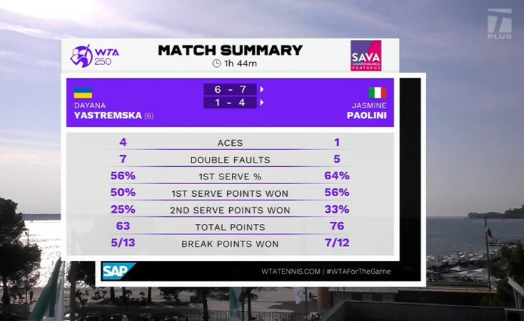 Даяна Ястремская (Украина, 6) — Жасмин Паолини (Италия) 6-7(5), 1-4, отказ
