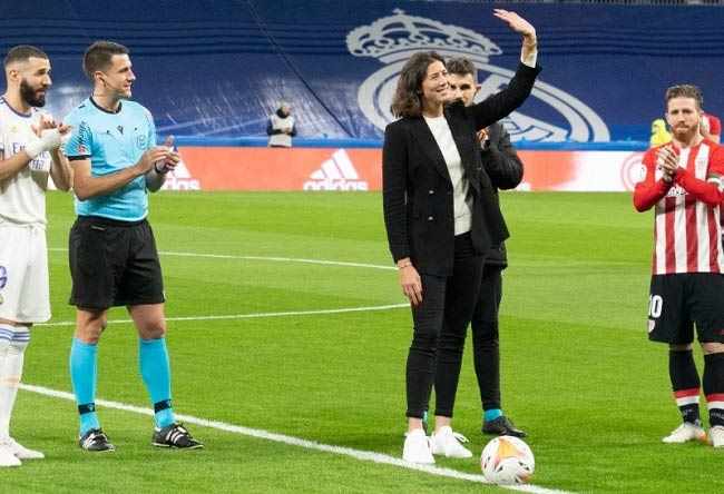 Перед началом игры на стадионе «Сантьяго Бернабеу» теннисистка нанесла символический первый удар по мячу.