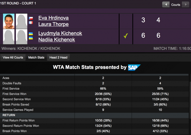 В стартовом поединке украинский дуэт одержал уверенную победу над чешско-французской парой Ева Хрдинова / Лаура Торп: 6-3 6-4. На счету наших теннисисток две подачи навылет, четыре двойных ошибки и четыре брейка.