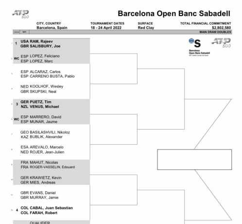В парном разряде в Барселоне сыграет Карлос Алькарас, который будет выступать в паре с Пабло Карреньо-Бустой. Первый матч они сыграют против Уэсли Колхофа и Нила Скупски.