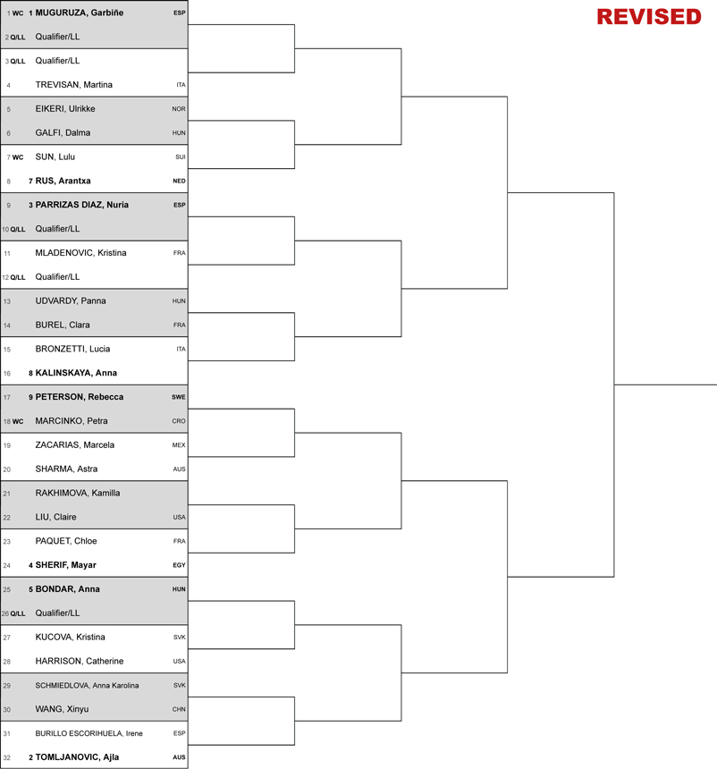 Десятая ракетка мира Гарбинье Мугуруса, получившая wild card, является единственной представительницей топ-40 в основной сетке турнира. В первом круге испанка сыграет против одной из победительниц квалификации или «лаки-лузера».