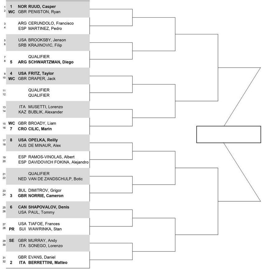 Кэмерон Норри, посеянный под третьим номером, на старте встретится с Григором Димитровым, а четвёртая ракетка турнира Тэйлор Фритц, сыграет против местного игрока Джека Дрейпера, получившего wild card.