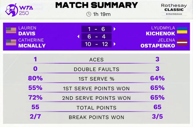 Людмила Киченок/Елена Остапенко (Украина/Латвия, 2) — Лорен Дэвис/Кэтрин Макнелли (США) 6:1, 4:6, 12-10