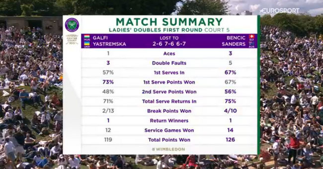 Сегодня матч возобновился во втором сете при счёте 4:3 в пользу Ястремской и Галфи, так как вчера встреча была прерван из-за дождя. На решающем тай-брейке теннисистки не реализовали три матчбола и перед тем, как проиграть, отыграли пять матчболов соперниц.