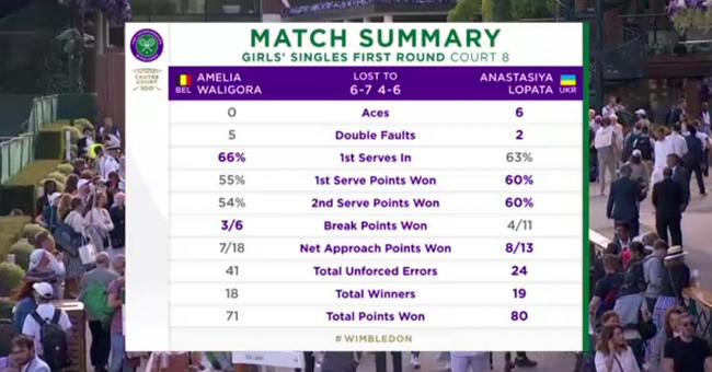 В первом сете украинской теннисистке удалось отыграться со счёта 3:5, а во втором Лопата заполучила преимущество после брейка в третьем гейме и затем повела 3:1. Бельгийка сравняла счёт при 4:4, однако украинка вновь взяла подачу соперницы и завершила встречу с первого матчбола.