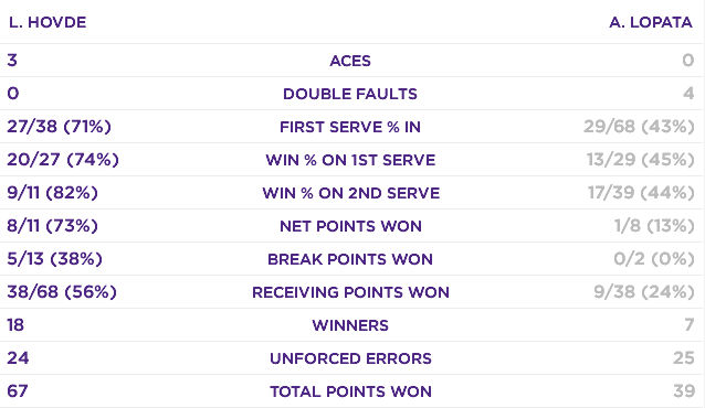 Матч продолжался 55 минут. За время, проведённое на корте, Лопата допустила четыре двойные ошибки, ни разу не подав навылет, проиграла пять геймов на своей подаче и упустила два брейк-поинта.