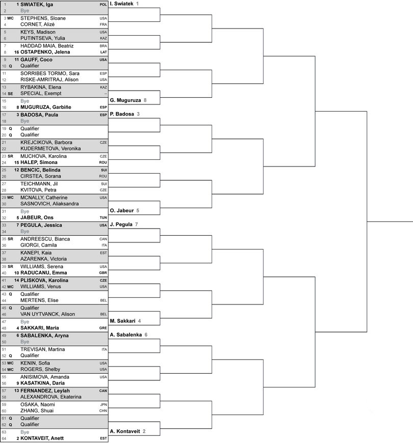 Вторая ракетка мира Анетт Контавейт свои выступления начнет матчем против одной из победительниц квалификации. В нижней половине сетки также сыграют Мария Саккари (4), Арина Соболенко (6) и Джессика Пегула (7).